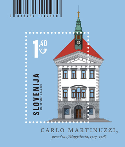 Po odločitvi, da serijo znamk Arhitektura na Slovenskem uvede ljubljanski Magistrat, je bilo torej ob podobi potrebno navesti pravo ime. Ko se je leta 1717 ljubljanska mestna oblast odločila za temeljito prenovo Rotovža, je namreč izdelavo načrta in modela zaupala Carlu Martinuzziju, ki je bil rojen v Furlaniji okrog leta 1673 in je bil tedaj že dalj časa vodilni arhitekt v mestu. Že ob koncu 17. stoletja je ljubljanski stolni dekan in škofov generalni vikar Janez Anton Dolničar z njim sodeloval pri pripravah na gradnjo nove stolnice. A če je tedaj še prevladovalo prepričanje, da je premlad in ne dovolj izkušen za tak podvig, je desetletje kasneje že lahko naredil načrte za ljubljansko semenišče, sočasno pa delal tudi za najzahtevnejše plemiške naročnike. Ko je leta 1710 dobil naziv kranjskega deželnega arhitekta, je njegov sloves že segal preko meja Kranjske, saj je tedaj skrbel za gradnjo kapucinskega samostana v Karlobagu.[4]