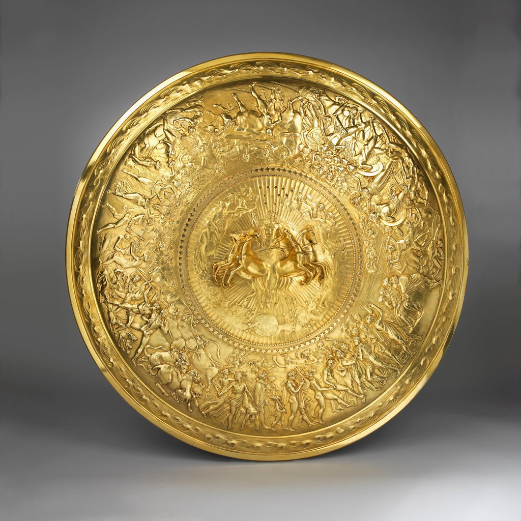 Toda, kraljeva zbirka je še bolj cenjena. Pri Koopman Rare Art (slika 3) so na TEFAF prinesli Ahilov ščit, cizelirano delo v pozlačenem srebru iz 1823, ki ga je izdelal angleški zlatar Philip Rundell. Izdelek je bil oblikovan po risbi neoklasičnega kiparja Johna Flaxmana, ki je natančno sledil Homerjevemu opisu junakovega ščita v Iliadi (njegove risbe so v Britanskem muzeju, osnutek izdelka v Sir John Soane’s Museum, London) in je bil narejen v petih primerkih. Prvega je kupil Jurij IV. in ga uporabil kot osrednji namizni okras na banketu ob kronanju leta 1821, obravnavanega si je nabavil njegov brat Ernest Avgust I. Hannovrski. Sejemska cena je bila več kot 5 milijonov funtov.