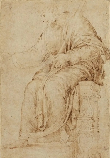 At the stand of the Dickinson Gallery, a newly attributed Michelangelo drawing was on display.[1] The piece, Study of Jupiter, was acquired anonymously in Paris in 1989 as the work of an unknown artist. It depicts Jupiter Enthroned and is based on a fragment of Roman marble, part of a collection owned by Giovanni Ciampolini in 15th-century Rome. Initially attributed to Domenico Ghirlandaio or Fra Bartolomeo, further research later identified it as the work of Michelangelo. The ascription is based on his training in Ghirlandaio’s workshop and his exposure to ancient sculpture through the patronage of Lorenzo de’ Medici. Scholars such as Paul Joannides, David Ekserdjian, Miles Chappell, and Zoltán Kárpáti have supported this identification. Central to their argument is the use of two distinct shades of brown ink, a technique unique to Michelangelo’s early work and absent from Ghirlandaio’s drawings. The sketch reveals Michelangelo’s emerging artistic style, with experimentation in form and a focus on mass and volume, though there are some weaknesses typical of a young artist.