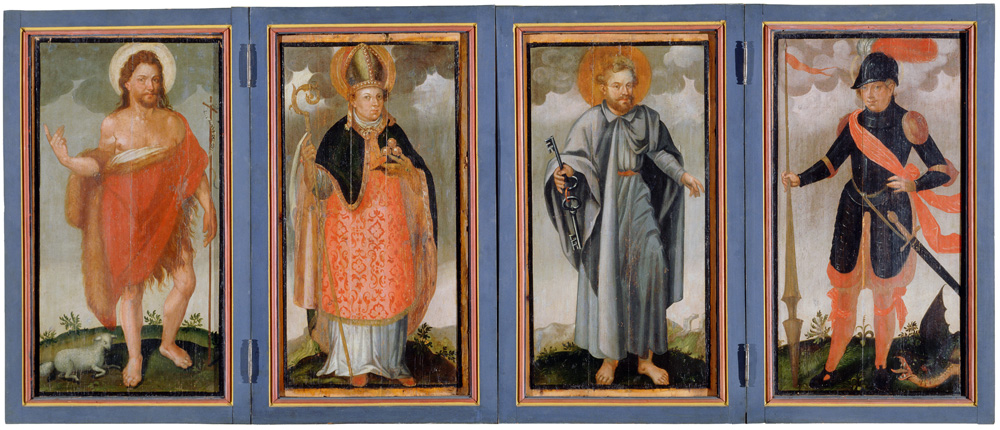 (1) Neznani slikar sredine 16. stoletja, Sv. Janez Krstnik, sv. Miklavž, sv. Peter, sv. Jurij (krilni oltar), tempera, les, 89,5 x 86,5 cm [46,5?], NG S 1298; Tomislav VIGNJEVIĆ, Srednji vek in 16. stoletje, Narodna galerija. Vodnik. Slikarstvo in kiparstvo v Sloveniji od 13. do 20. stoletja (ed. Barbara Jaki), pp. 7–25, p. 10, fig. 34, p. 25.