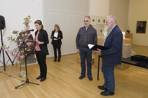 1. Red. prof. dr. Samo Štefanac prevzema od predsednik društva dr. Andreja Smrekara priznanje izr. prof. dr. Tinetu Germu (foto Matija Pavlovec. Z dovoljenjem Moderne galerije, Ljubljana).