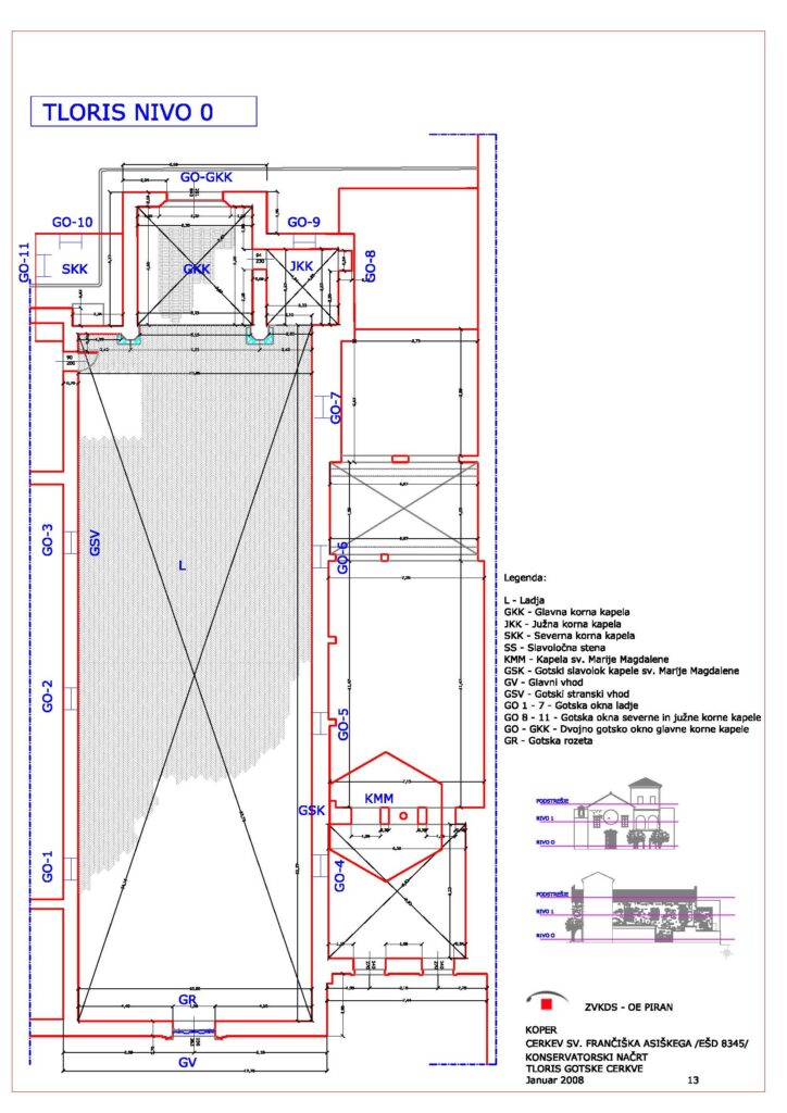 1. Koper, minoritska cerkev sv. Frančiška, tloris z vrisanimi lokacijami prvotnih oken (vir. ZVKDS, Območna enota Piran)
